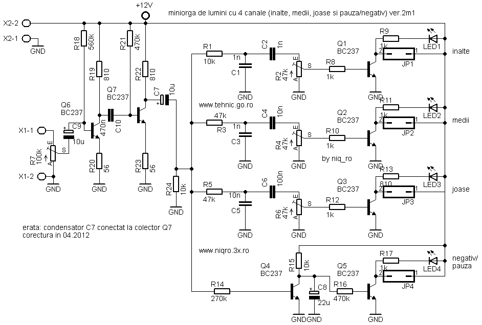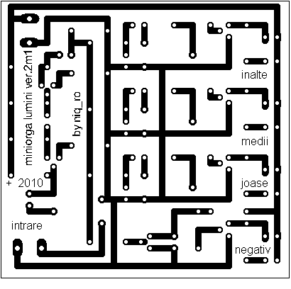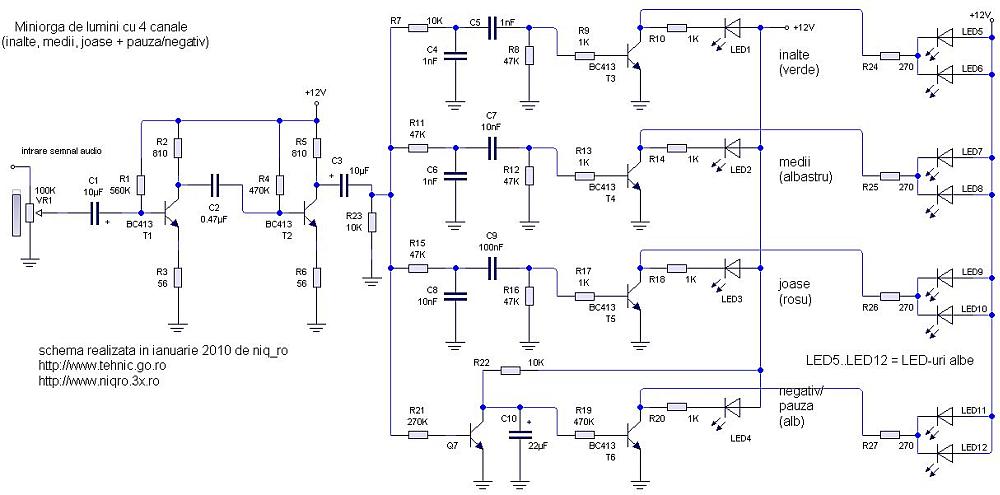 In ianuarie 2010, am realizat o miniorga de lumini cu 4 canale (inalte, joase, medii + pauza/negativ), a carei schema, de care am fost multumit, este:
