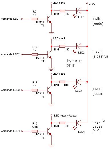 atingand, pe rand, terminalul rezistentei din baza fiecarui tranzistor (notate comanda LED..).
