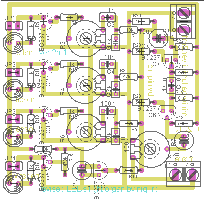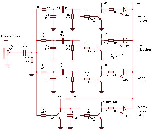 Dupa cum se constata, partea de preamplificator, filtrele trece banda si modul de comanda al LED-urilor sunt cele din articolul