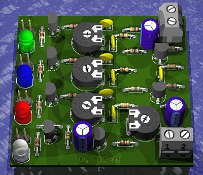 Deoarece am considerat ca montajul o sa fie doar de test, nu am mai folosit semireglabile pentru fiecare canal, la filtrele RC. Era bine sa le montez, deoarece receptorul radio nu reproduce bine frecventele joase si LED-ul rosu se aprinde mai slab, combinat si fabricatia lui (luminand mult mai slab la acelasi curent, comparativ cu celelalte), asa ca schema ar deveni (reglajul canalului negativ facandu-se din semireglabilul sau potentiometrul general, iar cele 3 canale din semireglabilele sau potentiometrele aferente: