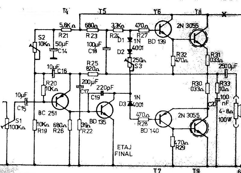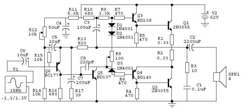 O schema "clasica" de amplificator cu tranzistoare 2N3055 si alimentare asimetrica a circulat prin anii '80, fiind prezentata in revista Tehnium.