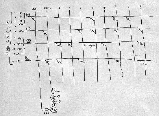 Ca sa aprindem 10 LED-uri pe rand, cuplam cele 10 LED-uri la iesirile corespunzatoare: