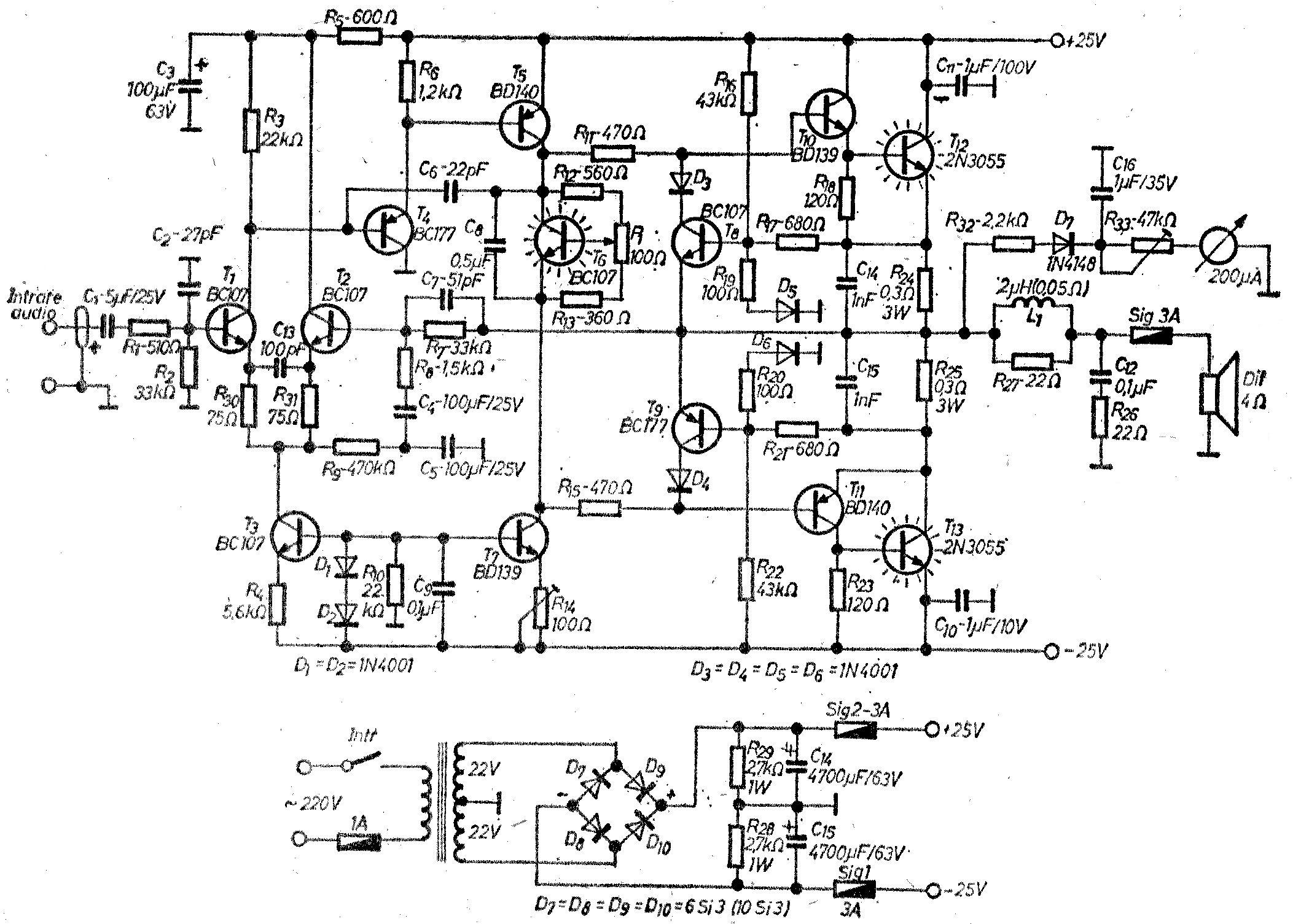 amplificatorului va trebui să asigure o tensiune de 25V pe un braţ (deci 2x25V) şi un curent maxim de 5A.