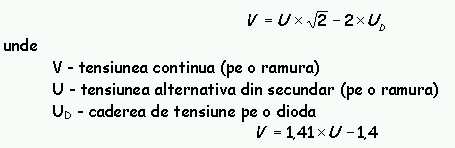 Pentru a calcuta valorile tensiunilor redresate (in sarcina) cunoscand tensiunile din secundarul transformatorului putem folosi formula aproximativa: