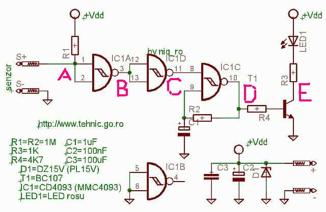 Cand senzorul este in apa, adica avem A=0 datorita faptului ca rezistenta apei este mult mai mica decat a rezistentei R1, vom avea la iesirea primei porti SI-NU (NAND) B=1, a doua poarta inverseaza semnalul de la intrarea ei deci C=0, in acest caz oscilatorul realizat cu poarta a 3-a este blocat, deci pe iesire va avea D=0 si in punctul E vom avea potential mare, aproape de tensiune de alimentare (tranzistor blocat) si LED-ul va fi stins.