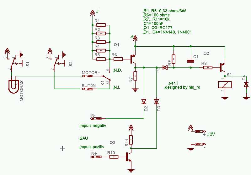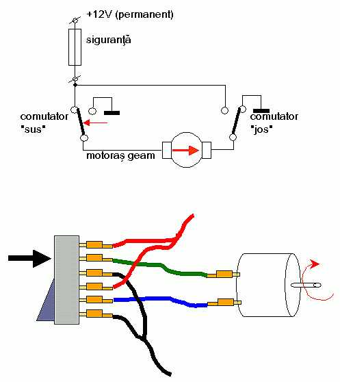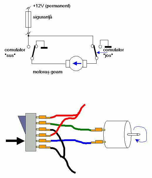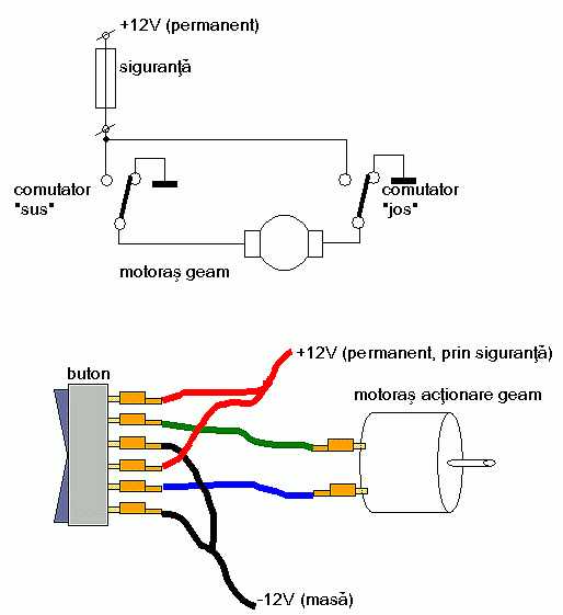Un motoras de geam electric este conectat, de obicei, cum am desenat mai jos, adica in repaus motorasul are ambele fire de alimentare la masa, deci "sta".