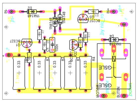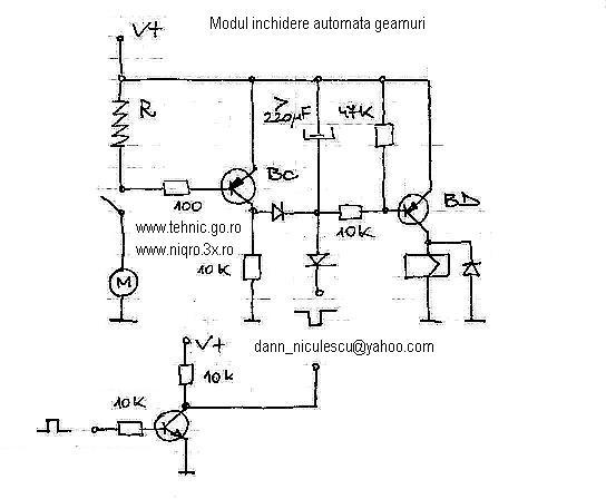 Construind modulul pe "submodule" (partea de detectie a supracurentului/partea de temporizare) , am observat ca, la blocare, in colectorul T1 apare saltul de tensiune de la zero la +Ua, aceasta explicand inversarea de catre mine a acelei diode, care in schema originala bloca "resetarea" temporizatorului ; am majorat valoarea C1 la 330 uF, pentru o temporizare de cca. 6 secunde (apreciat ca timp maxim pentru o cursa completa a geamului).