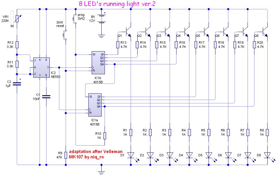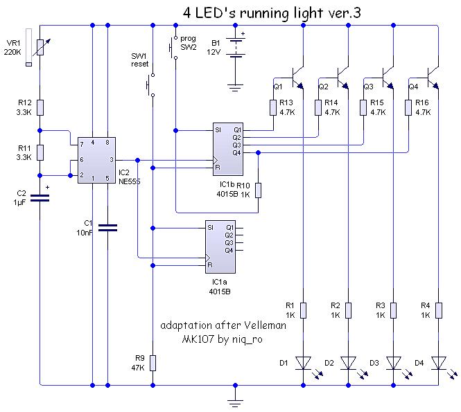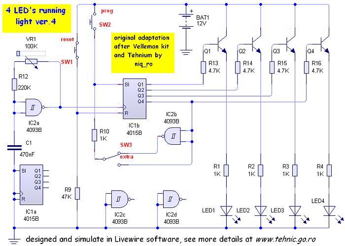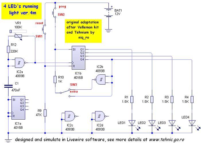 Schema prezentata in simulare si varianta mai simpla, in care LED-urile sunt comandate direct de CMOS-ul 4015: