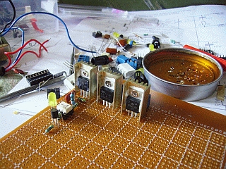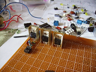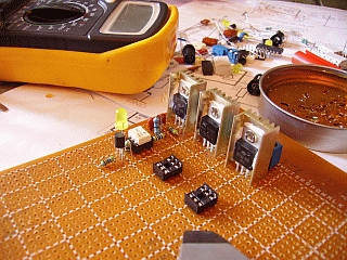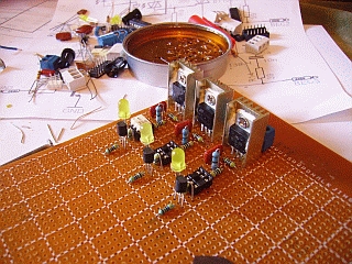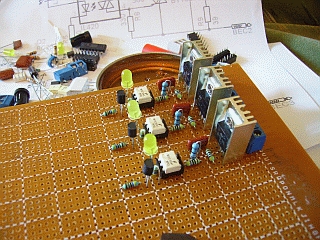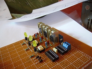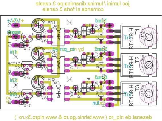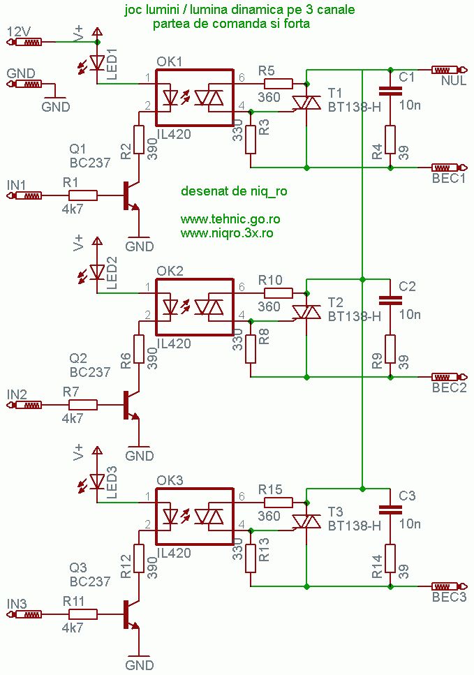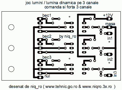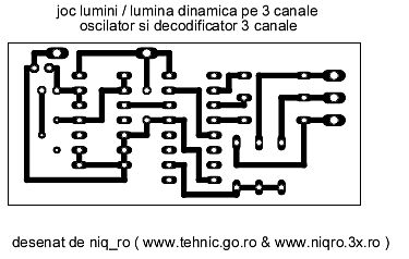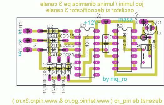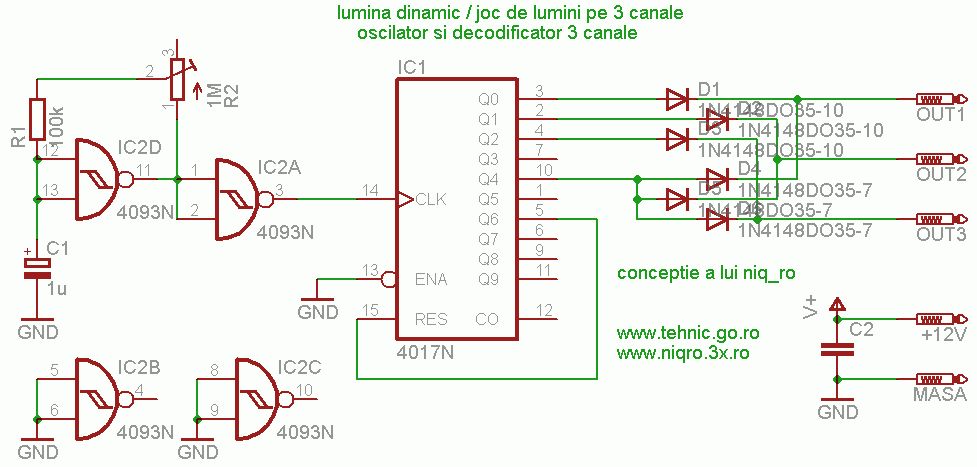 Ca urmare a unei solicitari de concepere si realizare a unui joc de lumini sau lumina dinamica cu 3 canale cu un anumit "model", m-am gandit sa utilizez integrate CMOS si anume pe 4093 (in configuratie de oscilator), pe 4017 (in configuratie de numarator si decodificator cu maxim 10 iesiri), o retea de diode pentru realizarea "modelului" si apoi partea de comanda si forta cu optocuploare si triace...