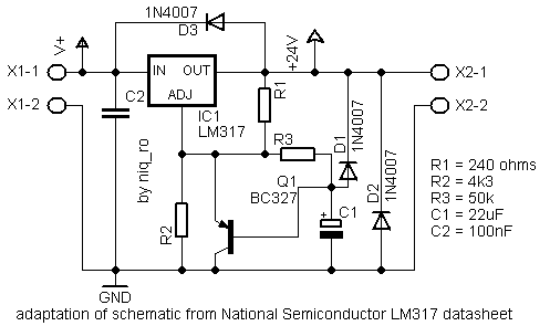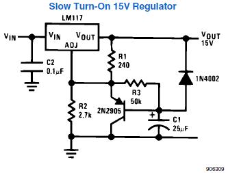 Dupa cum se observa, daca se elimina din schema tranzistorul, rezistenta R3, condensatorul C1 si dioda, se ajunge la schema clasica de utilizare a LM-ului. La cuplarea tensiunii de alimentare, baza tranzistorului este la masa, deoarece condensatorul este descarcat. Tensiunea de iesire Vout este foarte mica (aproximativ 2V), fiind suma tensiunilor dintre colectorul si emitorul tranzistorului (cca. 0,7V) si cea de referinta dintre Vout si Vadj (cca. 1,25V). Pe masura ce tensiunea pe condensatorul C1 creste, tensiunea dintre colector si emitor creste, pana tensiunea de iesire este cea determinata de raportul R2 si R1.