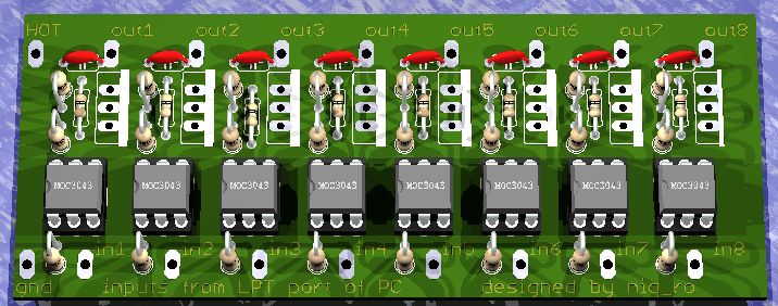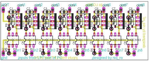 Un exemplu de utilizare pentru grupul optocuplor-triac gasim la www.discolitez.com, care reprezinta o mica orga de lumini pe 8 canale. Comanda celor 8 becuri se face de pe portul paralel al calculatorului, iar programul (soft-ul) lucreaza in combinatie cu WINAMP. Bineinteles ca tot de pe portul paralel se pot comanda cele 8 canale astfel incat sa avem un joc de lumini.