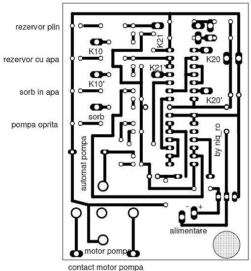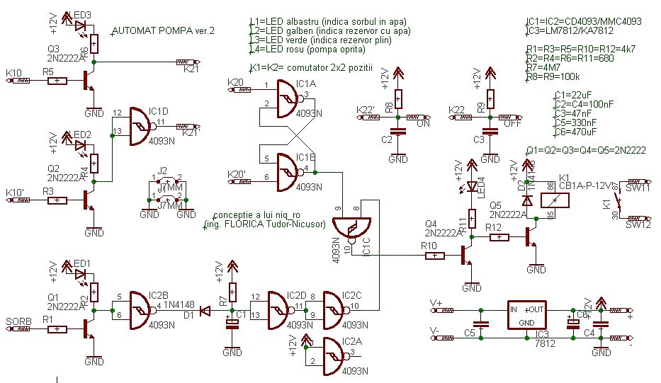 Principala conditie de functionare a pompei este aceea ca sorbul sa fie in apa (stare sorb). Schema permite fie pornirea (oprirea) "manuala" a pompei pentru folosirea apei in gospodarie (umplerea unei galeti cu apa), fie supravegherea umplerii unuia dintre rezervoare. Am folosit cuvantul "manuala", deoarece pompa nu va porni in cazul in care senzorul aflat in fantana nu se afla in apa. Comutarea intre modurile de functionare se face cu ajutorul comutatoarelor K1 si K2.