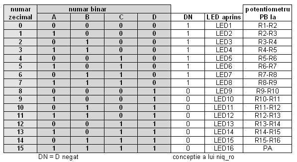 Un potentiometru digital cu 16 trepte care sa afiseze pe 16 LED-uri starea poate fi realizat cu integrate