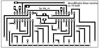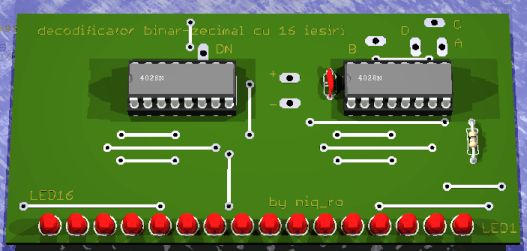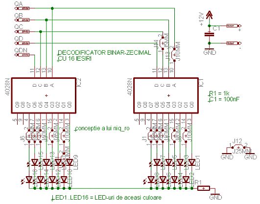 Partea de afisare a starii este realizata cu 2 decodificatoare binar-zecimal 4028 care comanda cele 16 LED-uri.