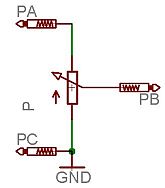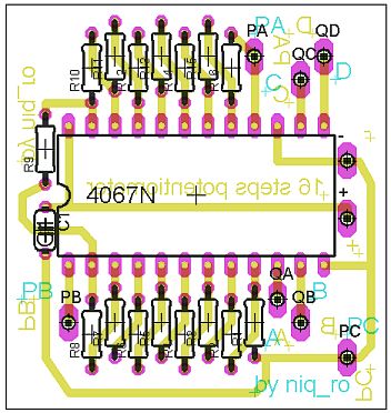 Potentiometrul propriu-zis este realizat in mai multe variante, una fiind cea cu integratul 4067, care permite cuplarea la iesirea PB (cursorul simulat) a diverselor grupari de rezistente. De asemenea, se pot folosi 2 integrate 4051.