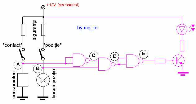 Uneori, se intampla sa uit(am) pozitiile aprinse cand am oprit autoturismul, asa ca m-am gandit la o schema care sa ma/ne avertizeze..