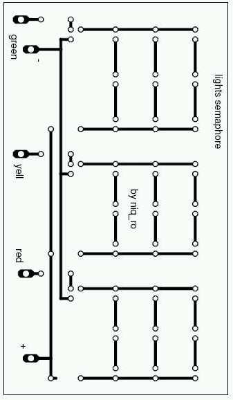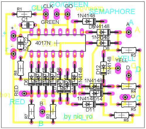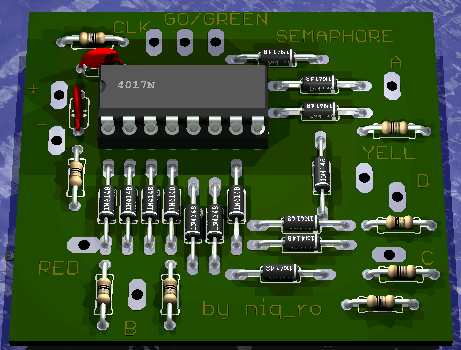 PS: Dupa cum se observa semaforul are cate un LED pentru fiecare culoare, iar afisarea este pe afisaje miniatura... dar se poate dezvolta pentru afisare vizibila de la distanta (prin comanda LED-urilor respective cu tranzistoare).
